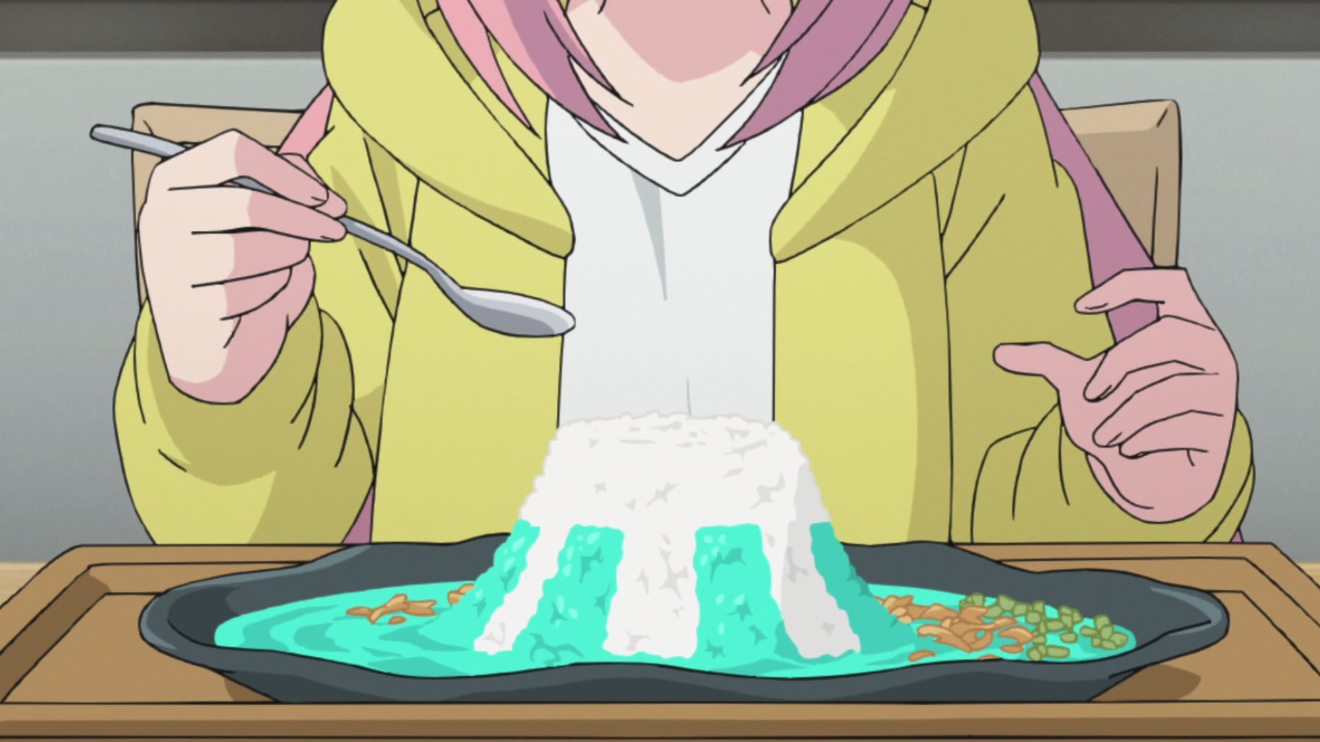 This is where the first stamp of the Yamanashi Girl Stamp Rally is located. It is a center built around Mt. Fuji and it's geography. Nadeshiko bought a blue Mt. Fuji Curry, Aoi bought a dessert of sorts, meanwhile Chiaki bought Lava Fried Chicken.